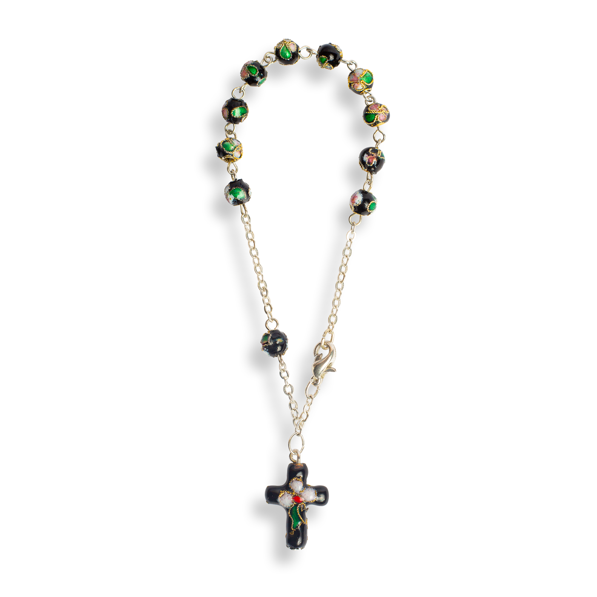 Różaniec w postaci bransoletki na rękę zawsze możesz mieć przy sobie, by świadczyć o swojej wierze i zawierzać codzienne życie Maryi. Różaniec jest wykonany z wyjątkową starannością z solidnego tworzywa z połyskującą powłoką, na której umieszczone są ręcznie malowane kwiaty. Bransoletkę wieńczy pięknie zdobiony krzyż. Świetnie prezentuje się na ręku i jest bardzo wygodna w użytkowaniu. Łańcuszek wykonany jest z metalu. Wygodne zapięcie ułatwia zakładanie bransoletki. Wspaniały pomysł na prezent.