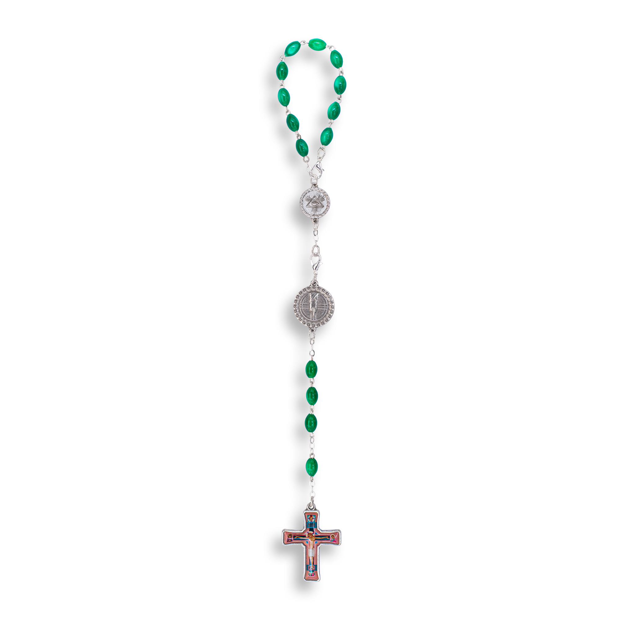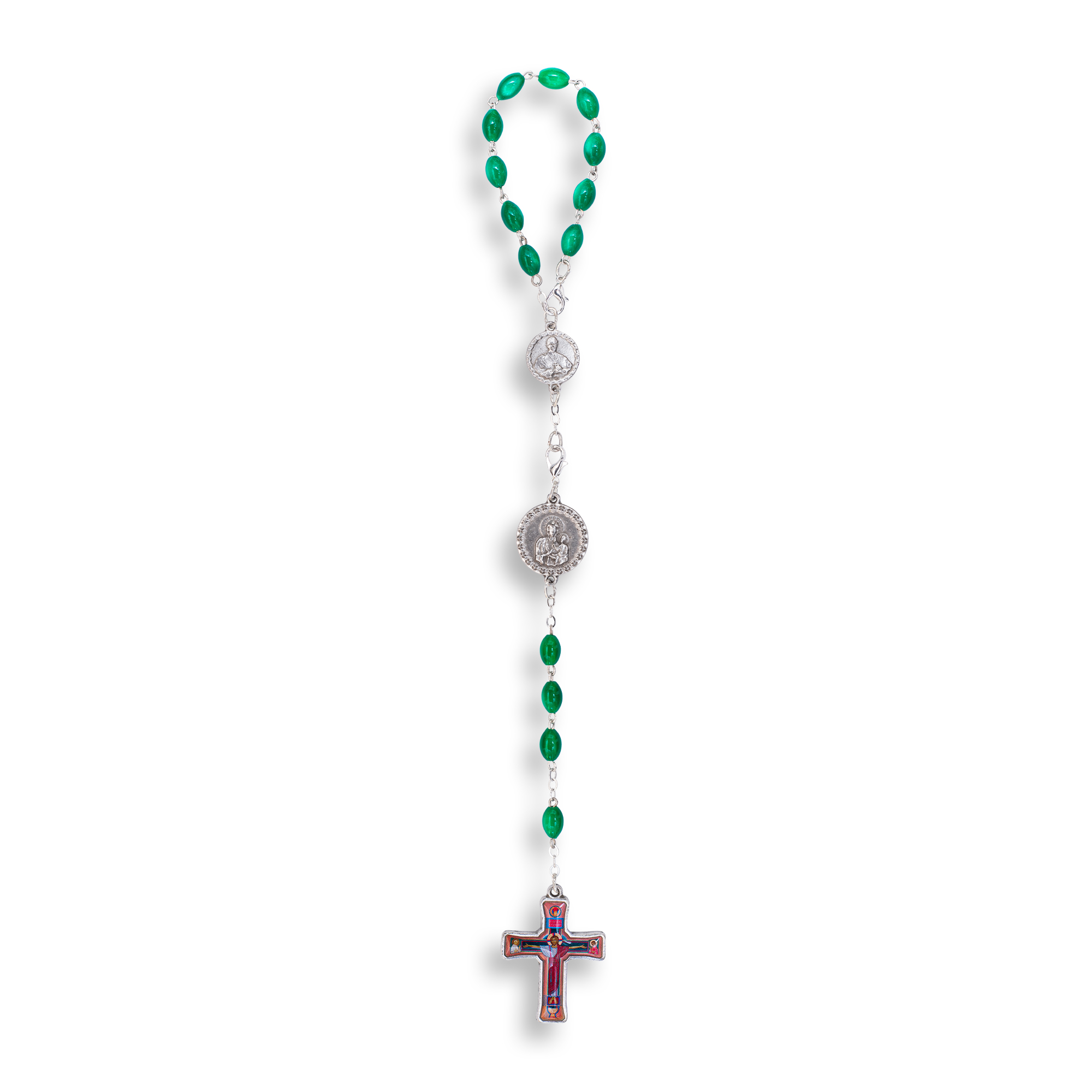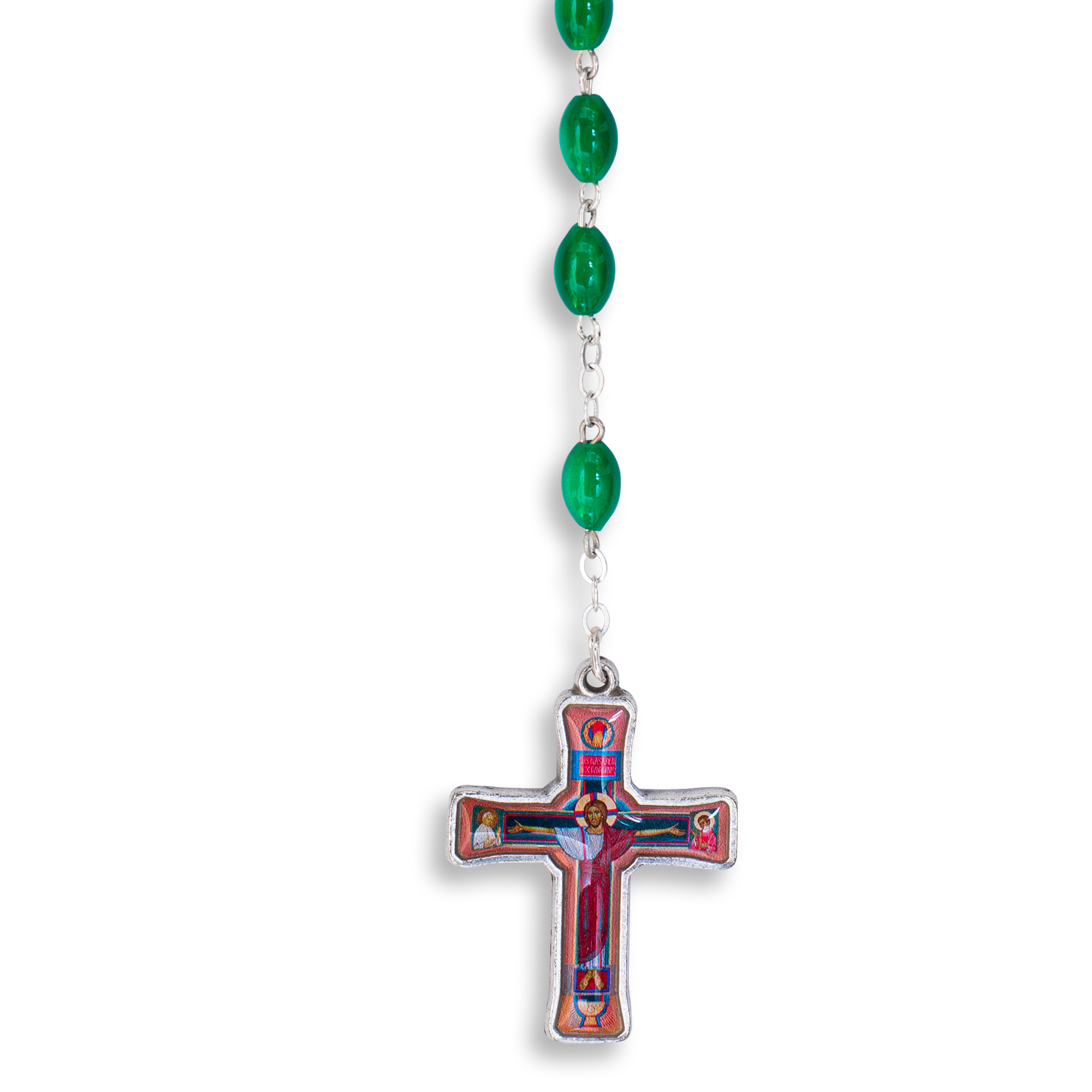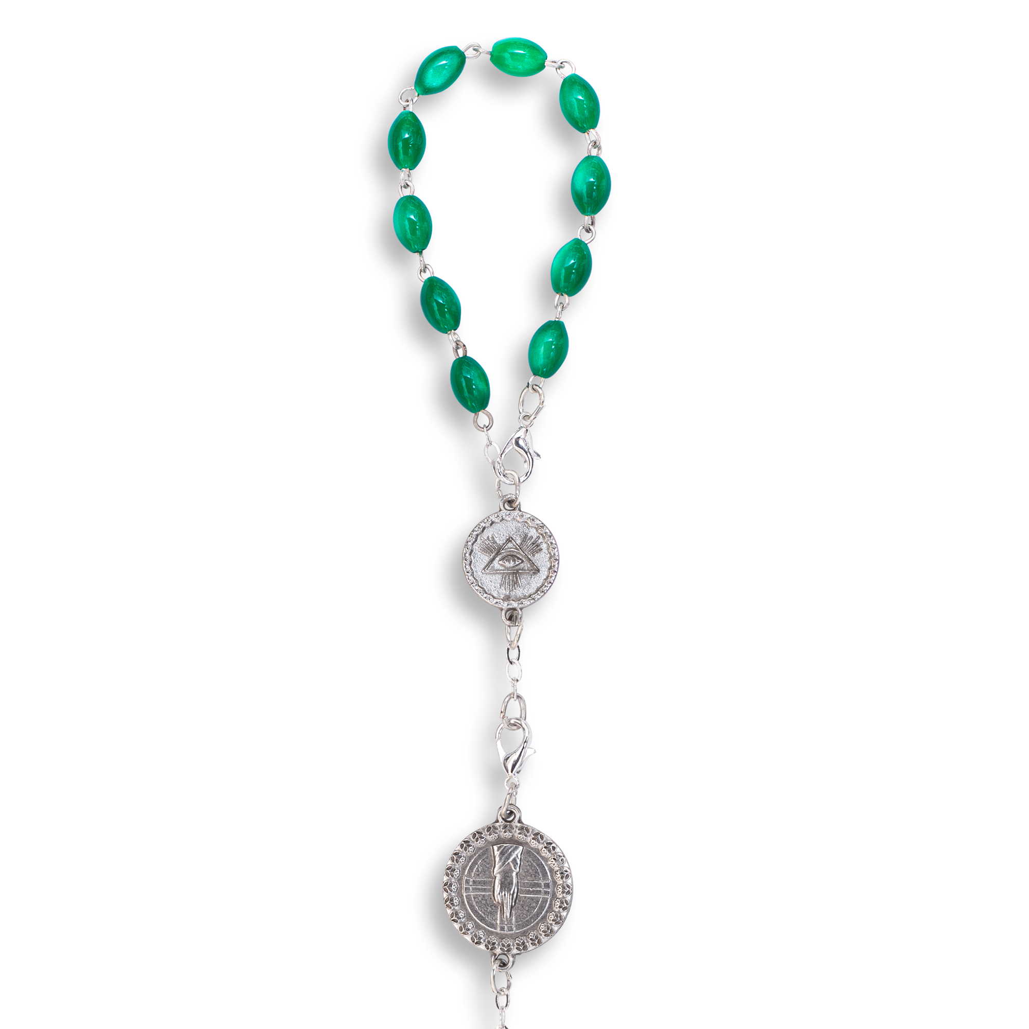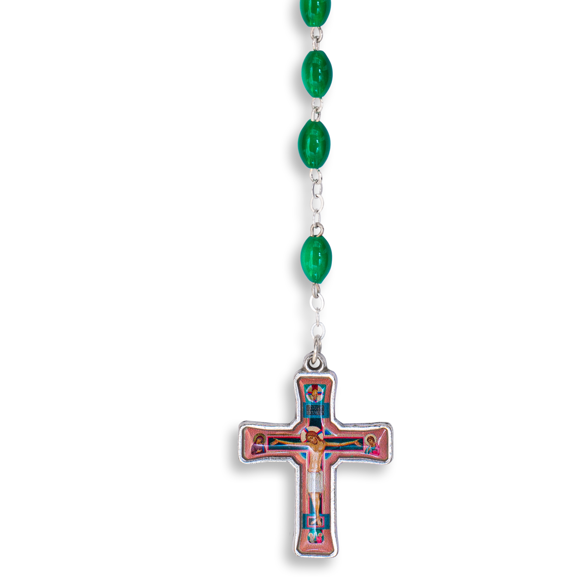 - Została wykonana z zielonych koralików Madre Perla o owalnym kształcie, które bardzo dobrze leżą w dłoni. Ich opalizujący zielony kolor symbolizuje Tajemnice Światła.
