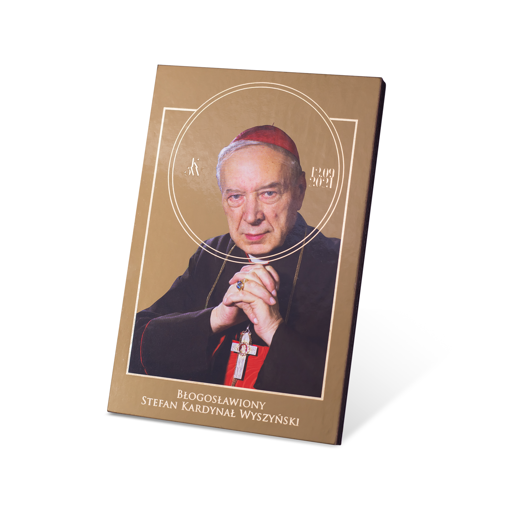 Obraz powstał na pamiątkę beatyfikacji Prymasa Tysiąclecia 12 września 2021 r. oraz uroczystego wprowadzenia Jego relikwii do Świątyni Opatrzności Bożej podczas XV Święta Dziękczynienia, 5 czerwca 2022 r. Reprodukcja nałożona na płytę z włókien drzewnych. Głębokie, nasycone barwy wraz z złoceniami tworzą wyjątkowy efekt wizualny.