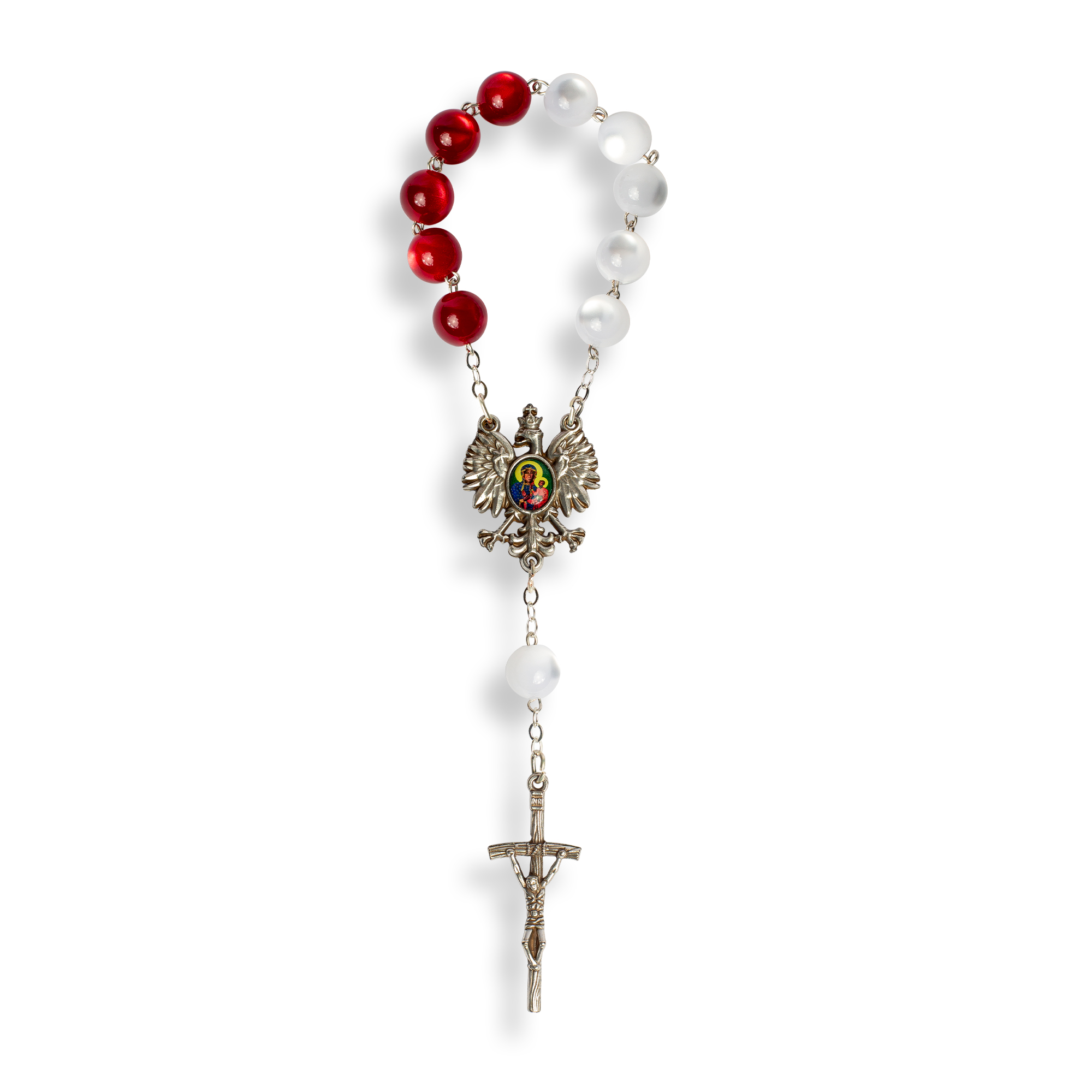 Różaniec patriotyczny – dziesiątka. Kulki w polskich barwach narodowych: białe i czerwone. Na szczycie dziesiątki Polski Orzełek w koronie. We sercu orła medalion z wizerunkiem Matki Boskiej Częstochowskiej oraz św. Jana Pawła II. Zwieńczeniem dziesiątki jest piękny rzeźbiony krzyż papieski.